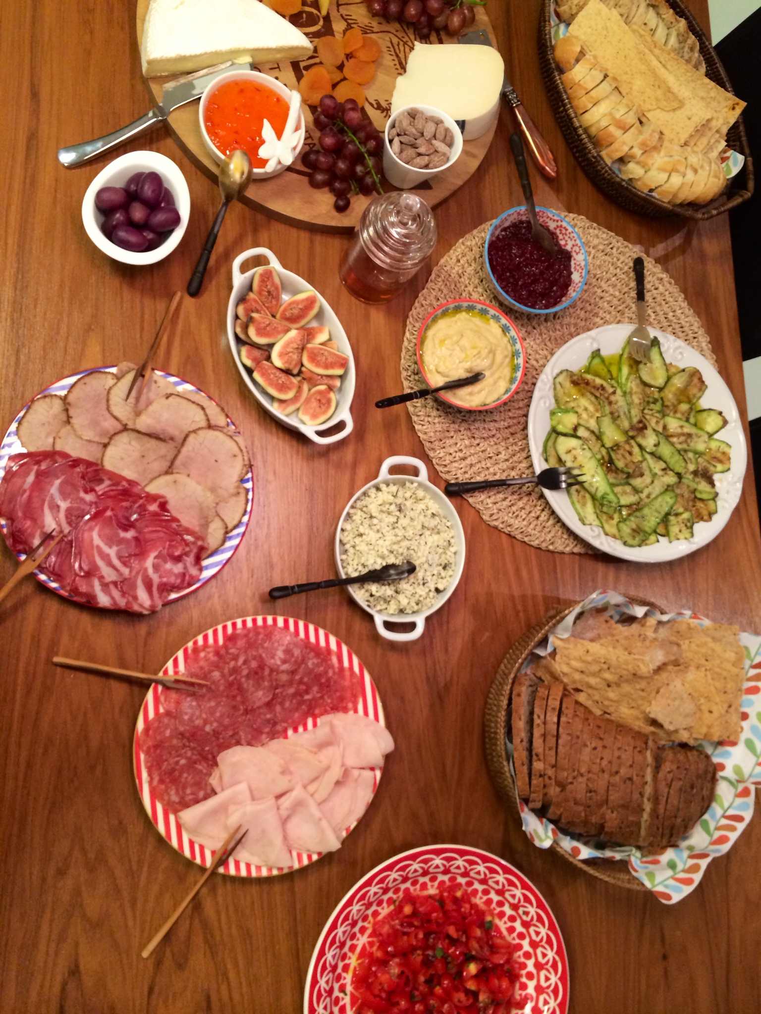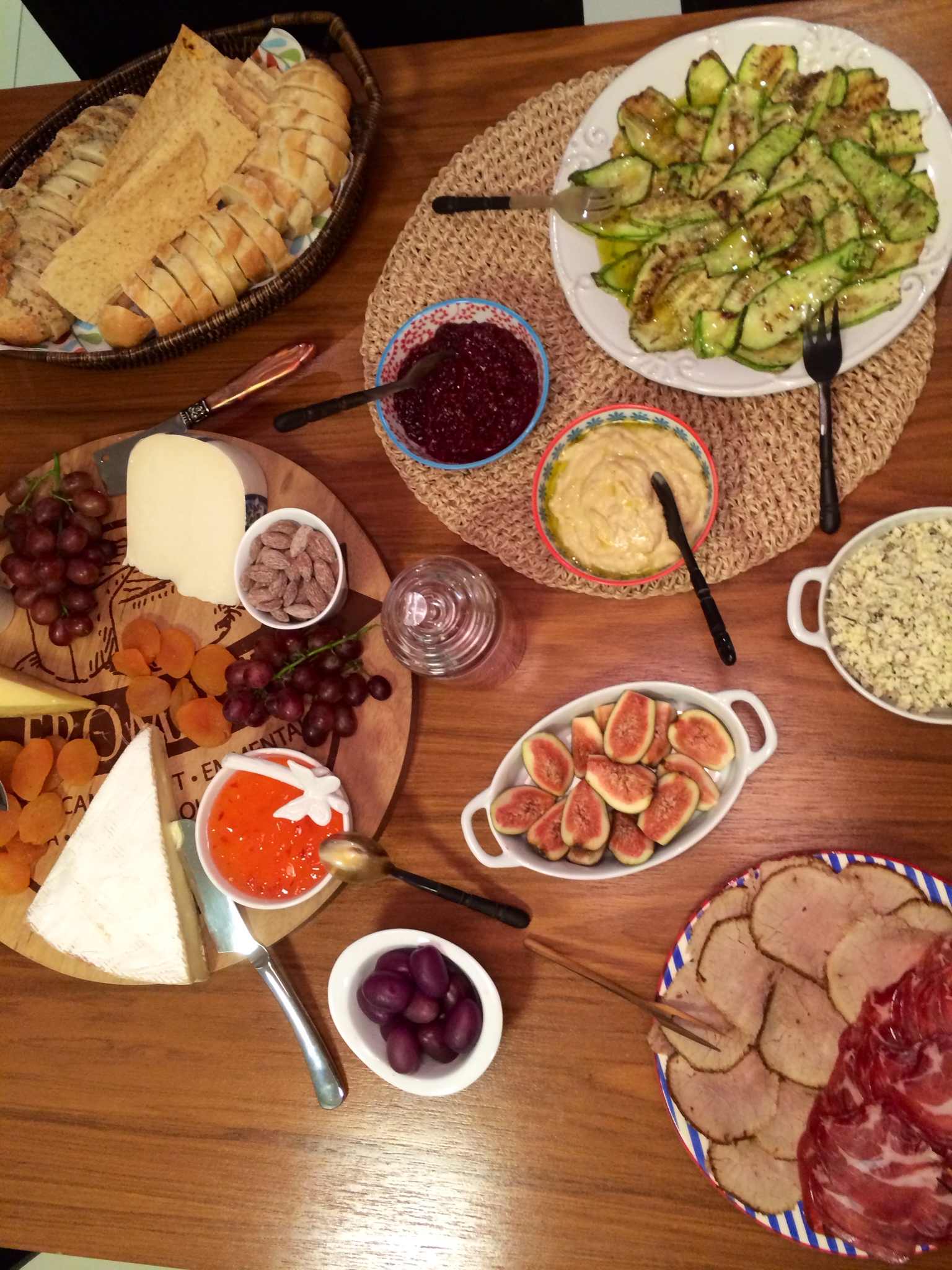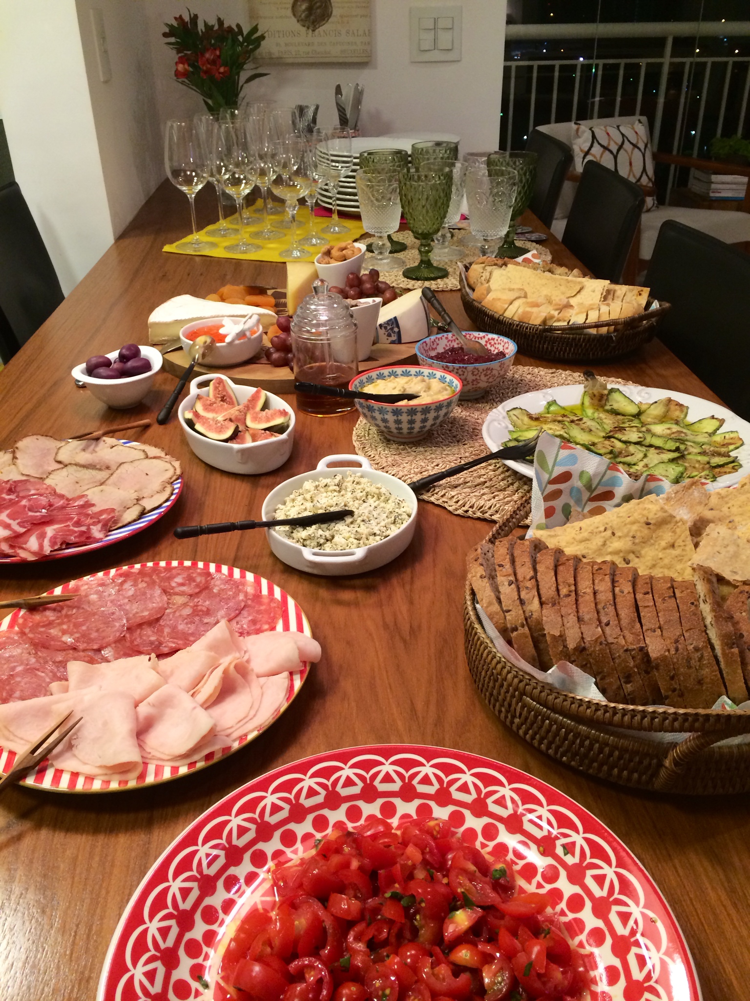 A idéia era fazer uma “mesa de antepastos” super casual para cada um se servir numa boa e a gente jogar conversa fora no sofá, então acho que funcionou bem!